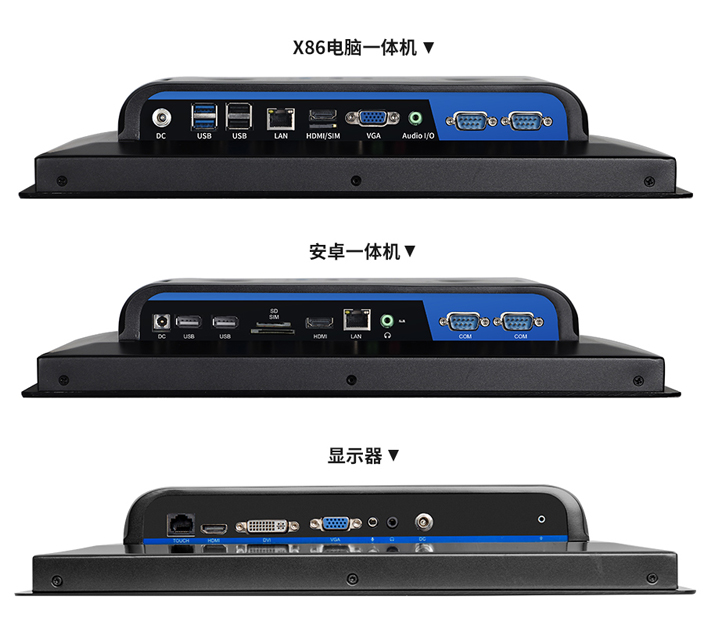 X86一體機(jī)下?lián)醢褰涌趶淖蟮接覄t是,DC充電口,4XUSB接口,LAN局域網(wǎng)接口,HD/SIM儲(chǔ)存卡槽,VGA視頻輸出接口,Audio I/O接口,2XCOM接口,上擋板預(yù)留2個(gè)COM口和雙WIFI天線(12-19寸)